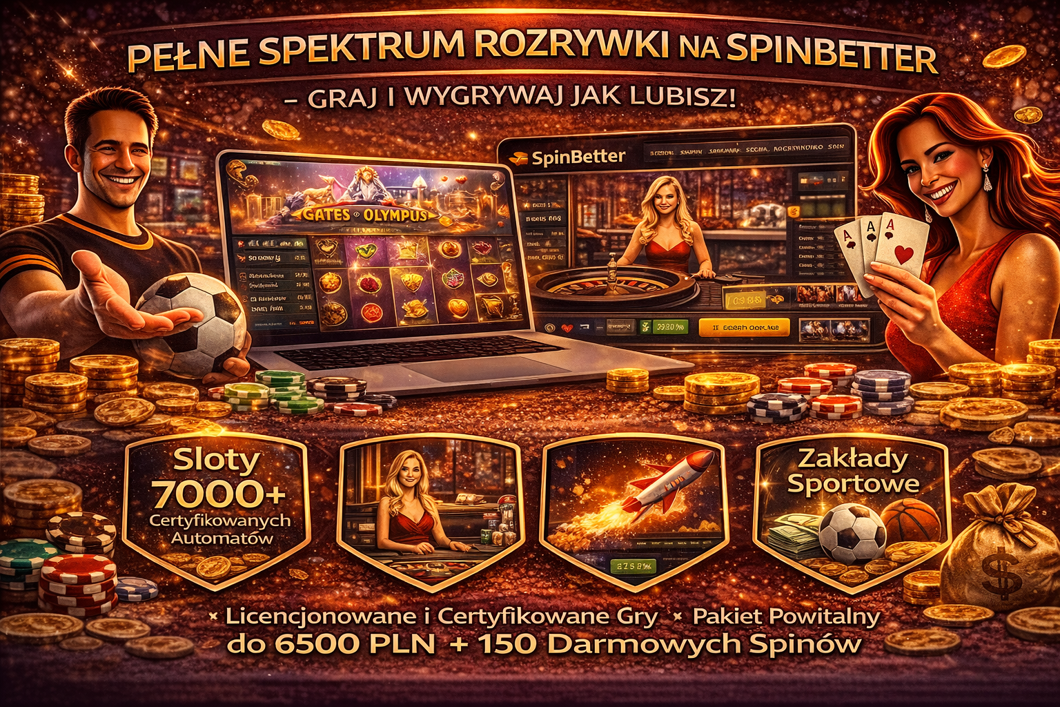 SpinBetter oferuje imponującą kolekcję ponad 7000 certyfikowanych slotów, nowoczesne gry crash oraz stoły z krupierami na żywo od czołowych światowych dostawców. Stworzyliśmy komfortowe warunki zarówno dla fanów gier hazardowych, jak i zakładów sportowych, zapewniając szybkie transakcje oraz wysoką jakość obsługi.